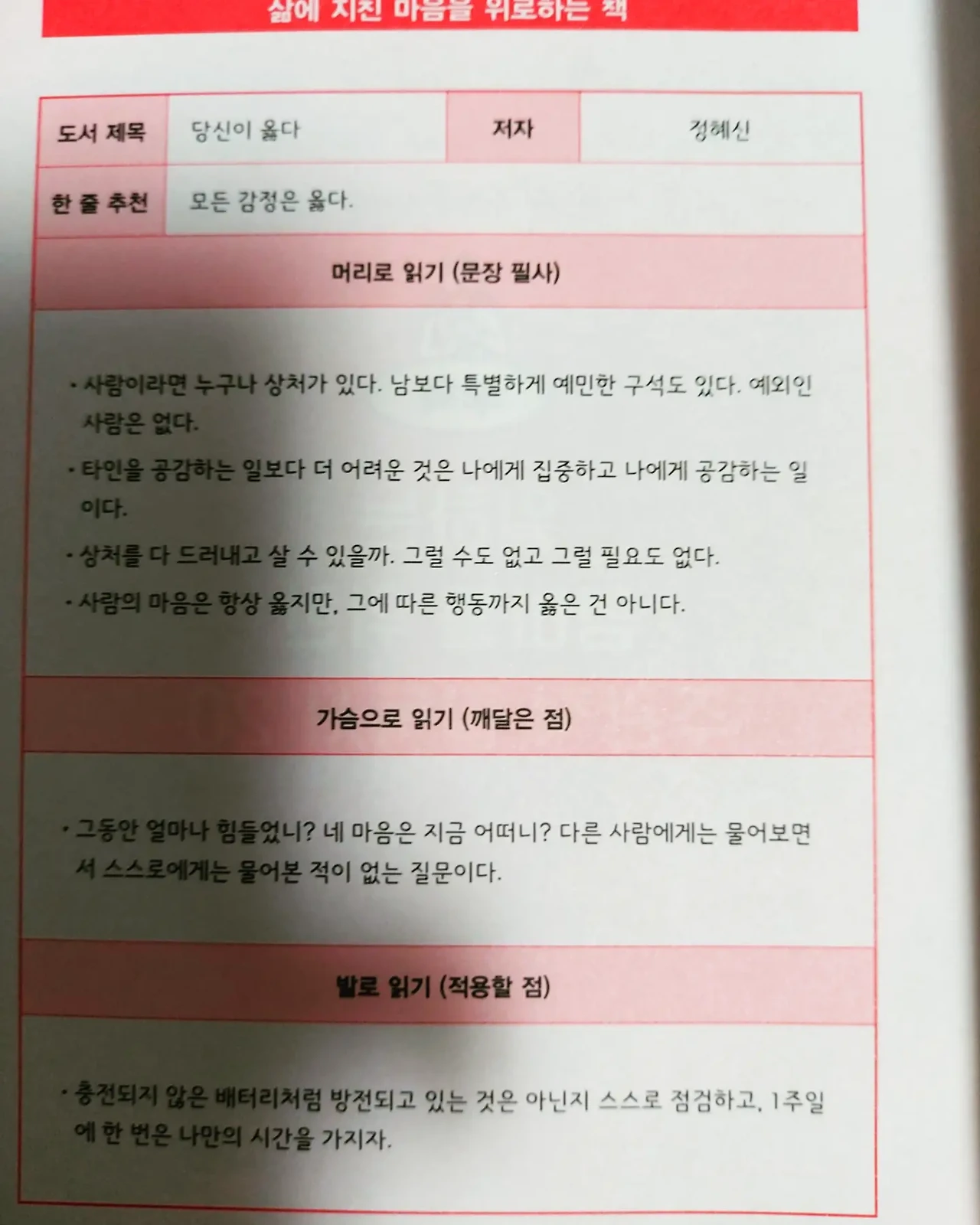 -그동안 얼마나 힘들었니? 네 마음은 어떠니? 다른사람에게는 물어보면서 스스로에게는 물어본적 없는 질문이다. 3.발로 읽기:(적용할 점)