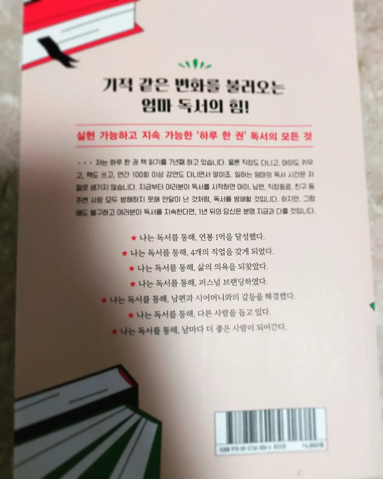 나는 독서를 통해 연봉1억을 달성했고, 4개의 직업을 갖게 되었으며.삶의 의욕을 되찾았고 .퍼스널 브랜딩하였다..또 남편과 시어머니와의 갈등을 해결했으며, 다른사람을 돕고 있고, 날마다 더 좋은 사람이 되어간다.