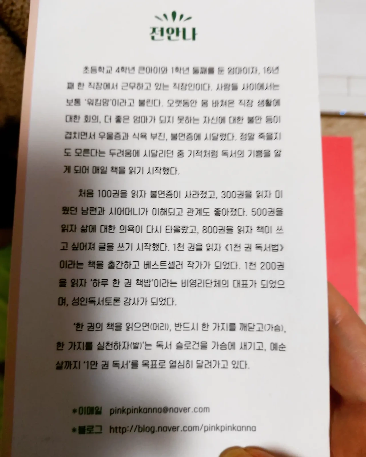 1천권독서법으로 유명한 전안나작가님의 책 저는 5년내에 1천권 독서를 하고 작가로 데뷔하는 것이 꿈이었습니다. 전안나 작가의 프로필을 보고 깨달았습니다. ‘1000권을 읽을 때면 나도 책을 쓰고 싶다는 생각이 절로 들겠구나’ 였습니다. 브런치작가로 활동하는 지금 저는 책보다는 글을 쓰고 싶은 마음이 더 크다는 것을 깨닫게 되었습니다.
