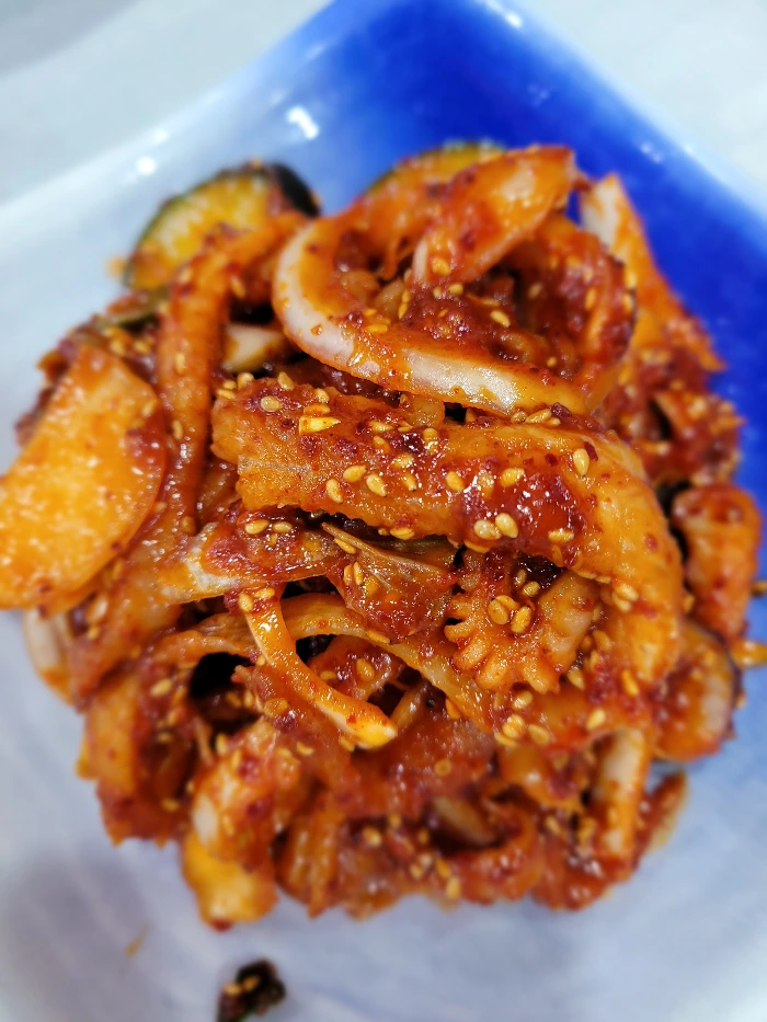 회덮밥과 함께 나오는 간자미회무침이다. 붉은색에서 풍겨져 나오는 새콤함, 아식 함, 쫄깃함 그리고 듬뿍 뿌려진 깨소금의 고소함이 입속에서 침을 고이게 한다. 나는 예전에는 간자미회무침을 아예 입에 대지도 않았었다. 그러나 이 집에서 처음으로 간자미회무침의 맛을 알게 됐다. 중학생인 아들 역시 요즘 아이답지 않게 이 집 간자미회무침의 매력에 푹 빠졌다.