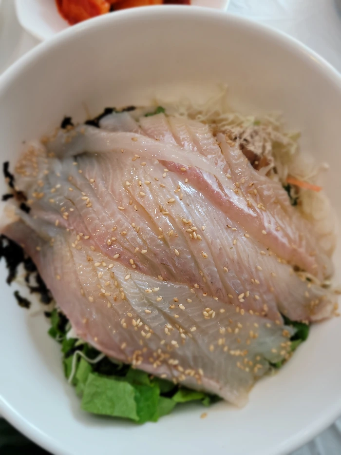 여러 가지 의구심을 갖은 채 인원수에 맞게 회덮밥과 우럭매운탕(대)을 시켰다. 그런데 얼마 되지 않아 나온 회덮밥에서 눈을 뗄 수가 없었다. 비주얼이 무척 낯설었다. 지금까지 알고 먹었던 회덮밥은 회덮밥이라고 부를 수 없을 지경이었다. 잘 손질된 광어 한 마리가, 길게 길게 썰려 통째로 대접 안에서 모든 야채와 밥을 살포시 덮고 있다. 마치 하얀 솜이불을 덮은 듯. 이게 진짜 회덮밥이구나 싶었다.
