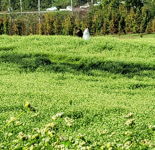 하얀 메밀꽃 천지 한가운데에 발걸음을 멈추고