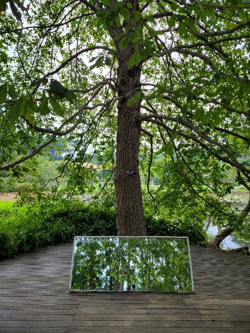 그러다 1975-0689 닛사 나무와 마주했다. 형상이 예사롭지 않지만 동갑내기 친구를 만난 듯 반갑다. 이 친구는 미국이 원산지다. 그래서 그런지는 몰라도 뭔가 특별해 보인다. 방부목 테크로 나무 주변을 정돈해 보호하고 있고 그 나무 아래에는 반사경으로 나무를 비추고 있다. 직감적으로 여기는 셀카포인트구나 싶었지만 수목원에서 그리 단순한 이유로 이 구조물을 설치했을 리는 만무했다.