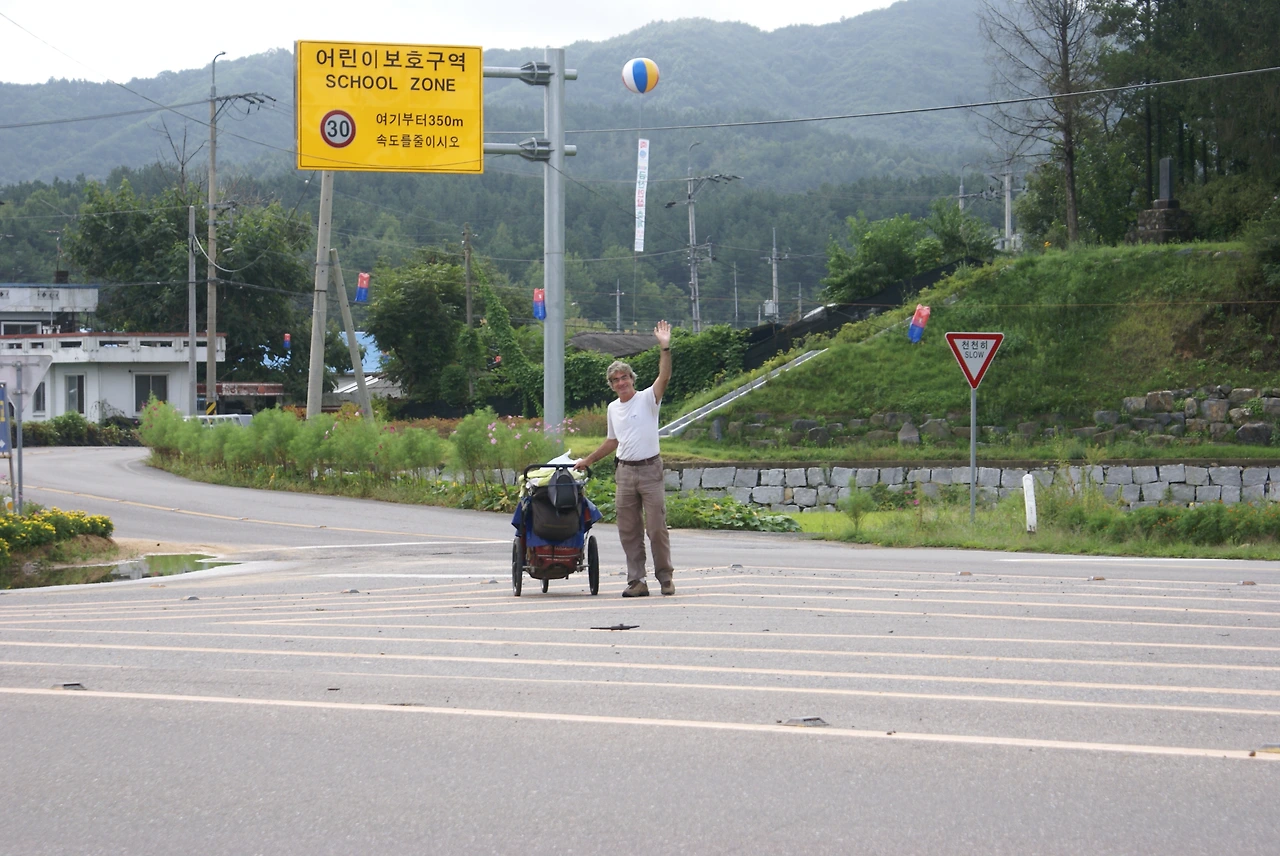 그는 캐나다 퀘벡출신의 '쟝(Jean)'이라는 예순을 바라보는 백인남성. 행색은 아주 초라해 보이지만 얼굴은 아주 자상한 아버지의 모습이었다. 그는 지금 8년째 대형유모차를 개조한 순수레에 짐을 가득 싣고 '걸어서' 세계일주 중 오십여 번째 방문국으로 우리나라를 여행 중이었다. 한국에 온 지는 며칠 안 됐고 서울을 출발해 평택~천안-대전-금산-익산-함평 등 전남지역과 제주를 거쳐 일본으로 가는 일정이었다. 그 후 필리핀, 대만을 거쳐 본국으로 돌아가는 계획으로 이동 중인 무전 여행자였다.
