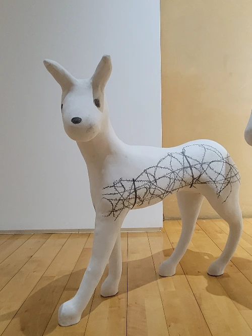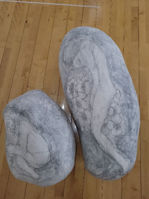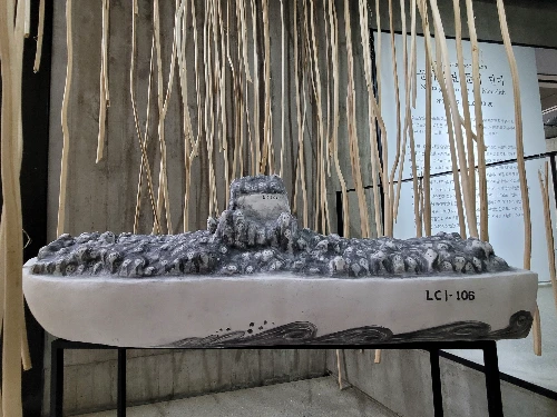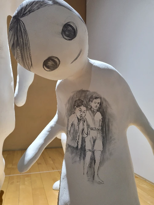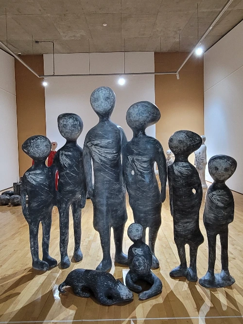 '돌아보면 돌이 된다 1인상'(스티로품, 우레탄폼, 지점도에 드로잉, 픽사티브)을 지나 '돌아보면 돌이 된다 3인상'이 전시실 입구에서 나를 맞이한다. 가족 같은 한 무리의 사람들이 관램객을 맞이한다. 웃으면서 맞이하는 듯 하지만 슬퍼 보이고 으슥한 느낌이 든다. 그렇게 34개의 마지막 작품까지 하나하나 감상한다.