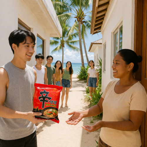 보라카이에 도착해서는 숙소를 직접 구해야 했다. 비수기라 방값은 비싸지 않았지만 돈도 잃은 상황이라 한 푼이라도 아끼려 여러 집을 돌며 흥정했다. 몸이 지쳐갈 무렵 마지막으로 들른 한 집, 방도 넓고 인심 좋아 보이는 여자 주인이 반겼다. 나는 배낭에서 한국인의 소울푸드 '신라면'을 꺼내 들었다. 라면 한 봉지를 보여주자 그녀는 단번에 "오! 신라면!"을 외쳤다.(그녀는 이미 많은 한국 여행객을 상대했던 터라 신라면에 대해서 잘 알고 있었다.) 이 때다 싶어 내가 신라면을 건네며 방값을 깎아달라고 하자 그녀는 흔쾌히 우리가 원하는 가격에 방을 내어주었다.