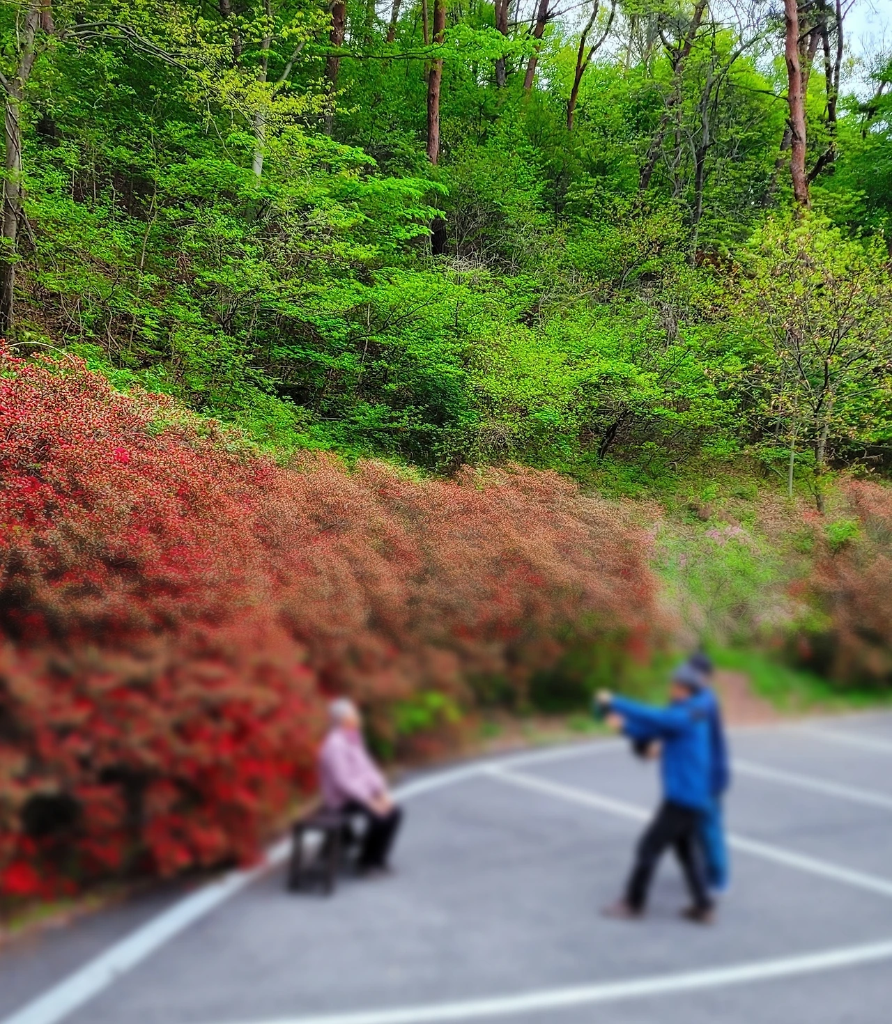 그 흥분이 채 가시지 않은 상황에서 우리는 다시 주차장으로 발길을 돌린다. 그 순간 우리의 시선을 단번에 사로잡는 일 가족. 벚꽃처럼 분홍색 점퍼를 입으신 할머니를 꽃 화단 앞 벤치에 모셔 놓고 연신 사진을 찍는 머리 희끗희끗 나이 지긋해 보이는 남자 두 분이 보인다. 친구와 나는 가던 길을 잠시 멈추고 그들의 표정을 살핀다.