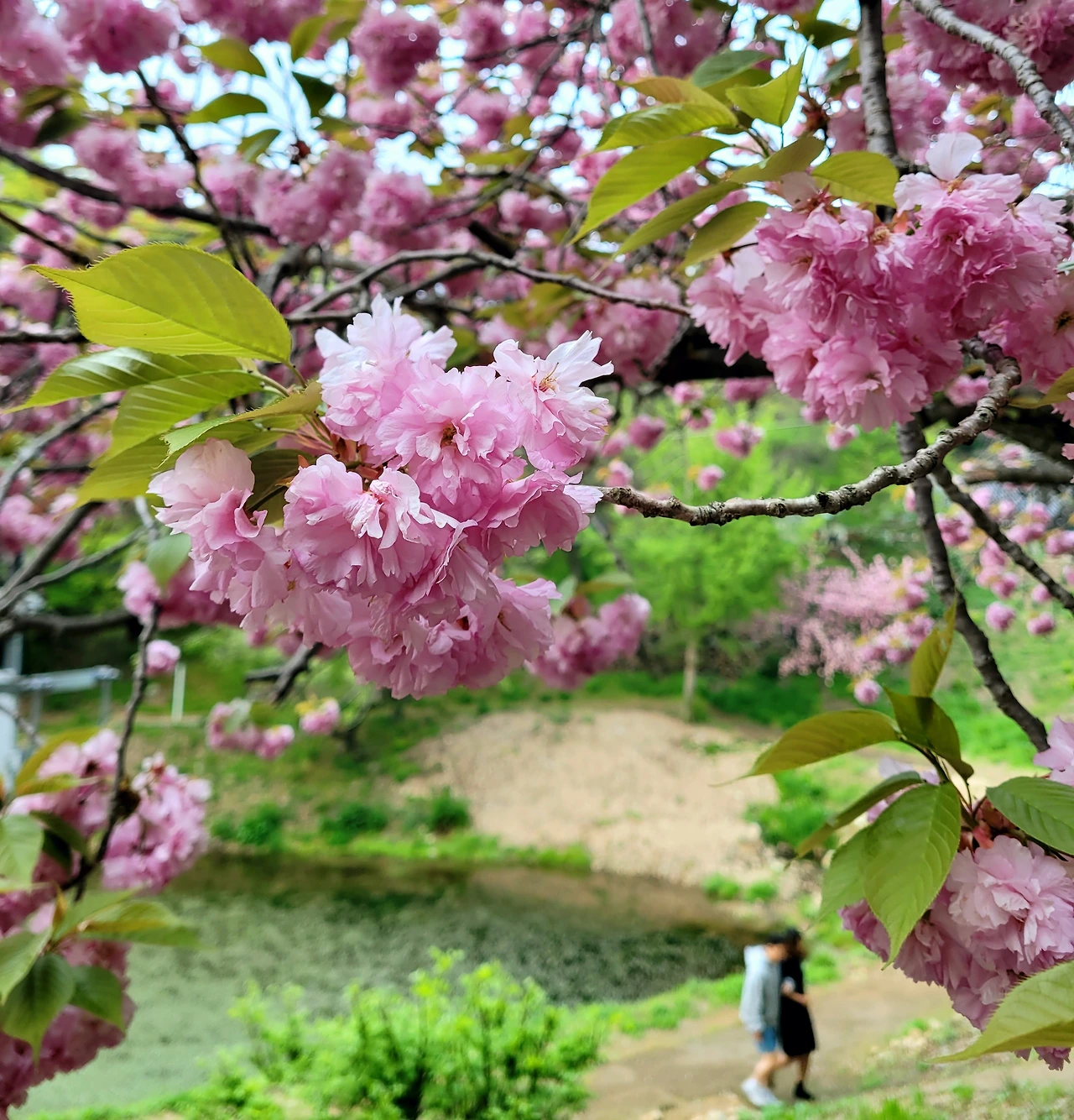 우리는 주차장을 지나 문수사로 이어지는 좁은 길을 따라 걷는다. 길가에는 말로만 듣던 주먹만 한 분홍빛 겹벚꽃들이 주렁주렁 달려있다. 바람이 살랑살랑 불 때마다 한 장씩 날리는 꽃잎과 그 꽃잎이 날리는 순간에 맞춰 연신 셔터를 눌러대는 연인들의 모습이 사랑스럽고 정겨워 보인다.