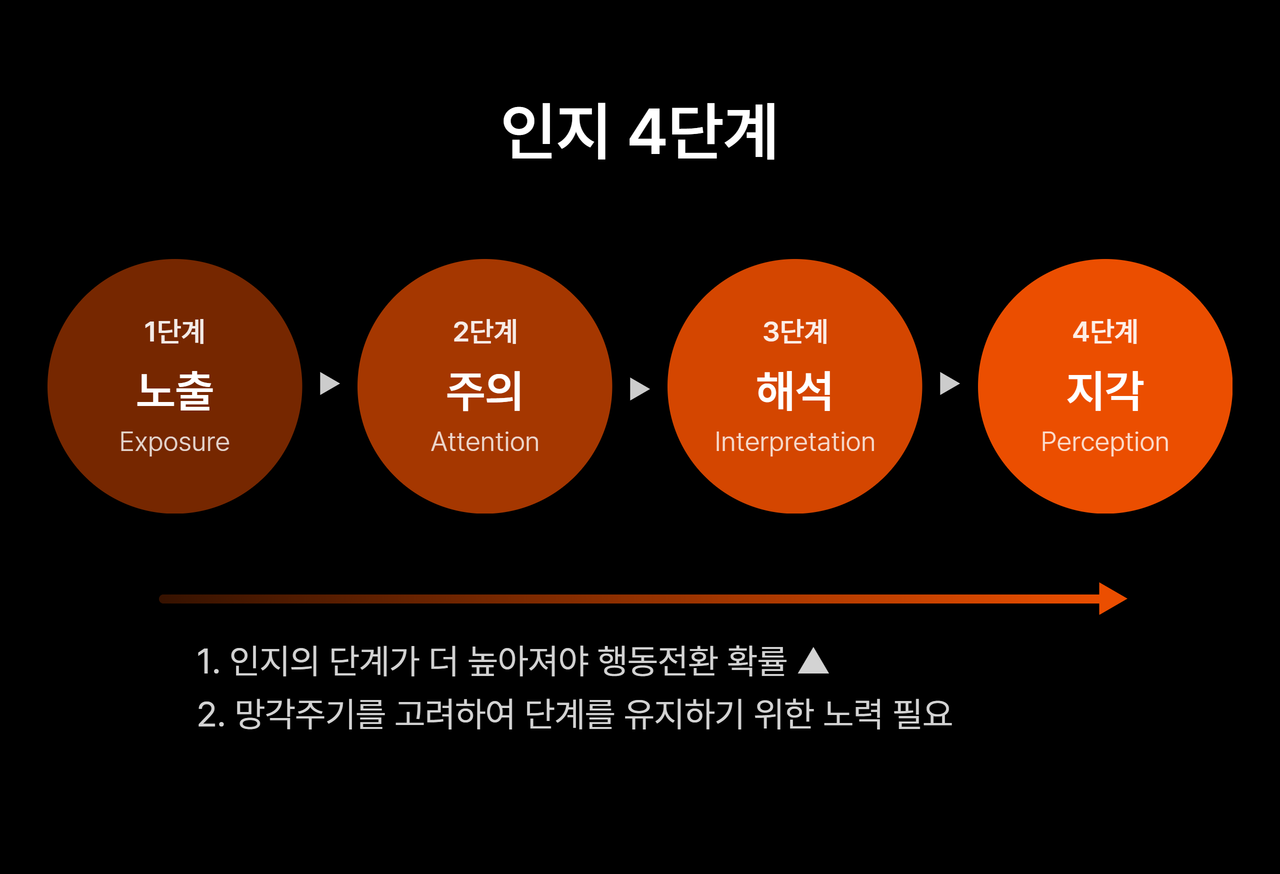 소비자행동론에 의하면, 인지는 노출(exposure) - 주의(attention) - 해석(interpretation) - 지각(perception) 등 4단계를 거쳐 나타납니다. 당연히 높은 인지단계일수록 구매나 추천 등의 행동을 할 확률이 높아지며, 인간의 망각주기로 인해 소비자의 인지 단계는 자연스럽게 시간이 흐르며 떨어지게 되지요.