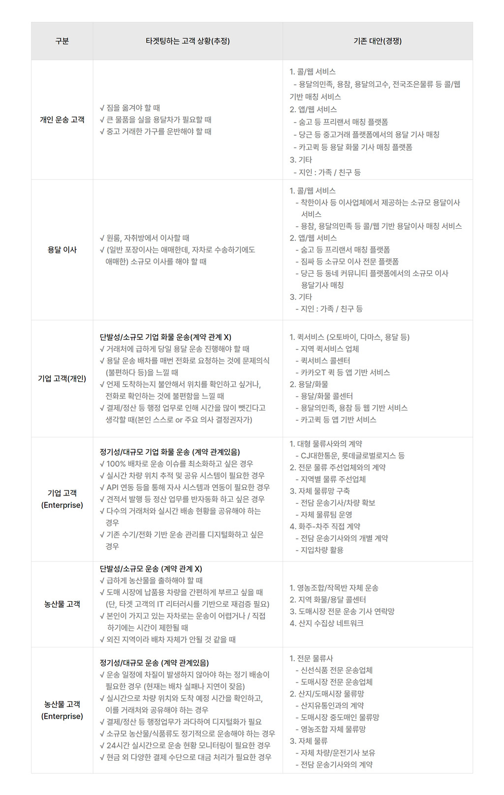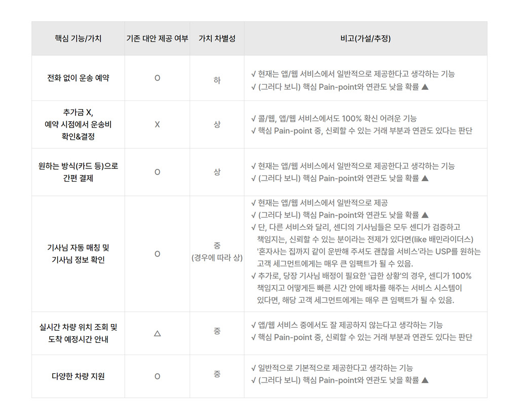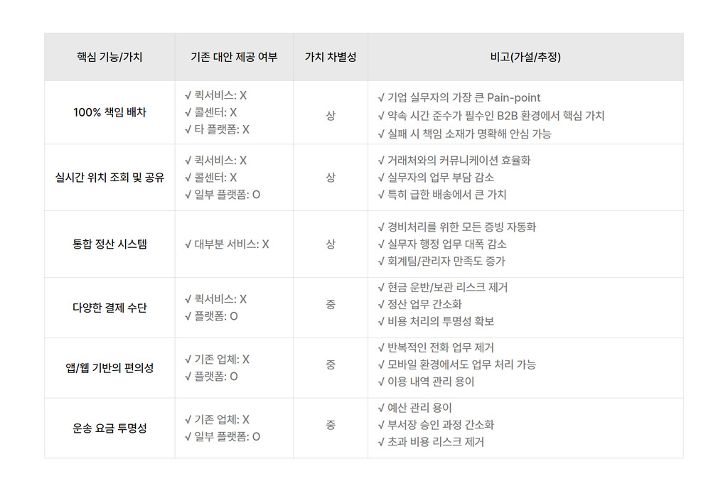 실제로도 센디의 '기업/사업장용 운송 서비스 모델'이 USP가 있는 서비스 모델인지를 2번에서 도출한 기존 경쟁 대안과 센디를 비교하며 추론해보았습니다.