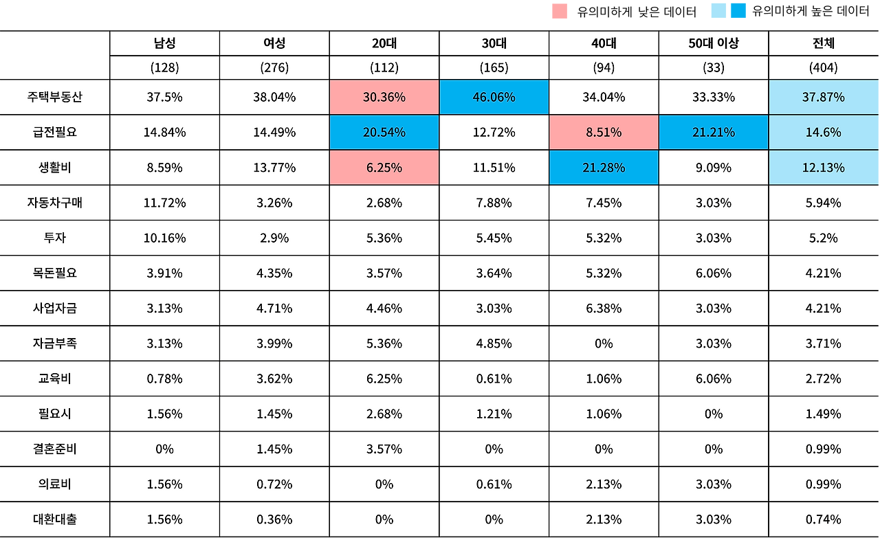 '주택 부동산'과 '급전필요'의 경우 30대가 자산 형성기에 본격적으로 진입하는 연령대라는 점과 20대 중 사회초년생 비중이 많다는 점을 반영하고 있었습니다. 그리고 '생활비'의 경우 일정 수준의 경제적 기반을 갖춘 40대가 자녀 양육과 부모 부양이 동시에 일어나는 '샌드위치 세대'라는 특성이 반영된 결과로 해석됩니다.