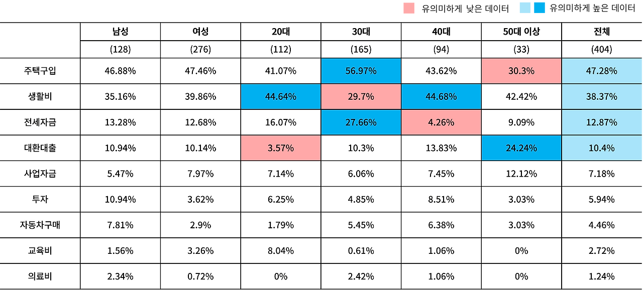 40대와 50대 이상은 주택구입(43.62% / 42.42%)보다 생활비(44.68% / 30.3%)가 더 높았고, 전세자금(4.26% / 9.09%)보다 대환대출(13.83% /24.24%)이 더 높았다.