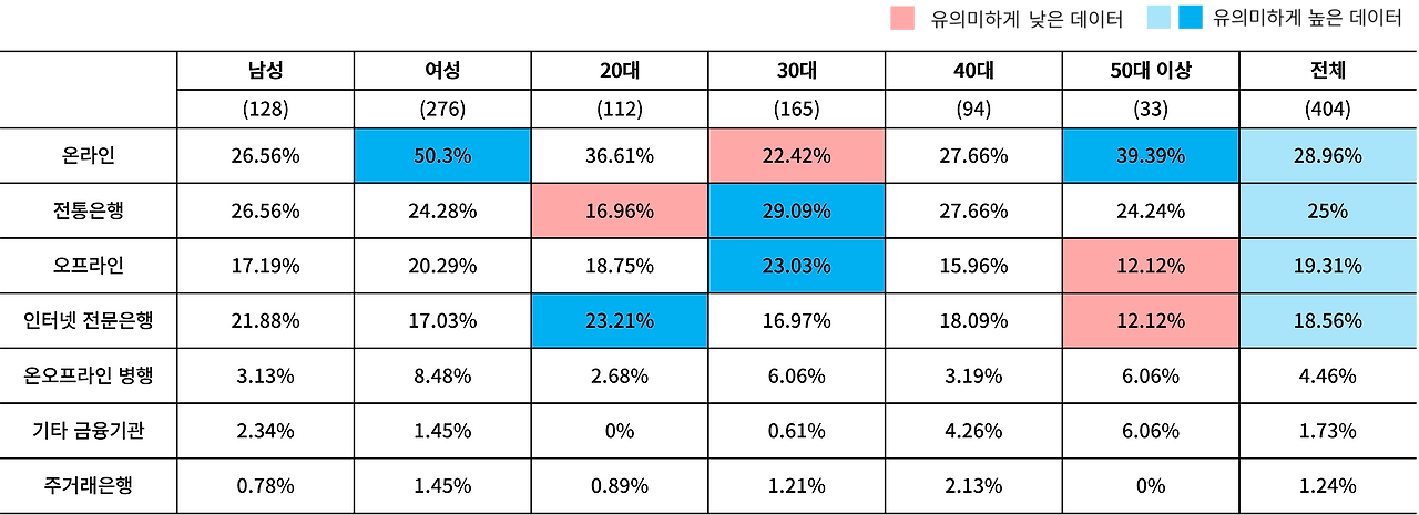 20대는 온라인(36.61%) > 인터넷 전문은행(23.21%) > 오프라인(18.75%) > 전통은행(16.96%) 순으로 비대면 중심의 접근 성향이 강하게 나타났다.