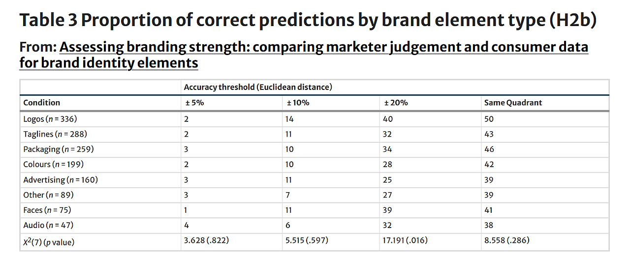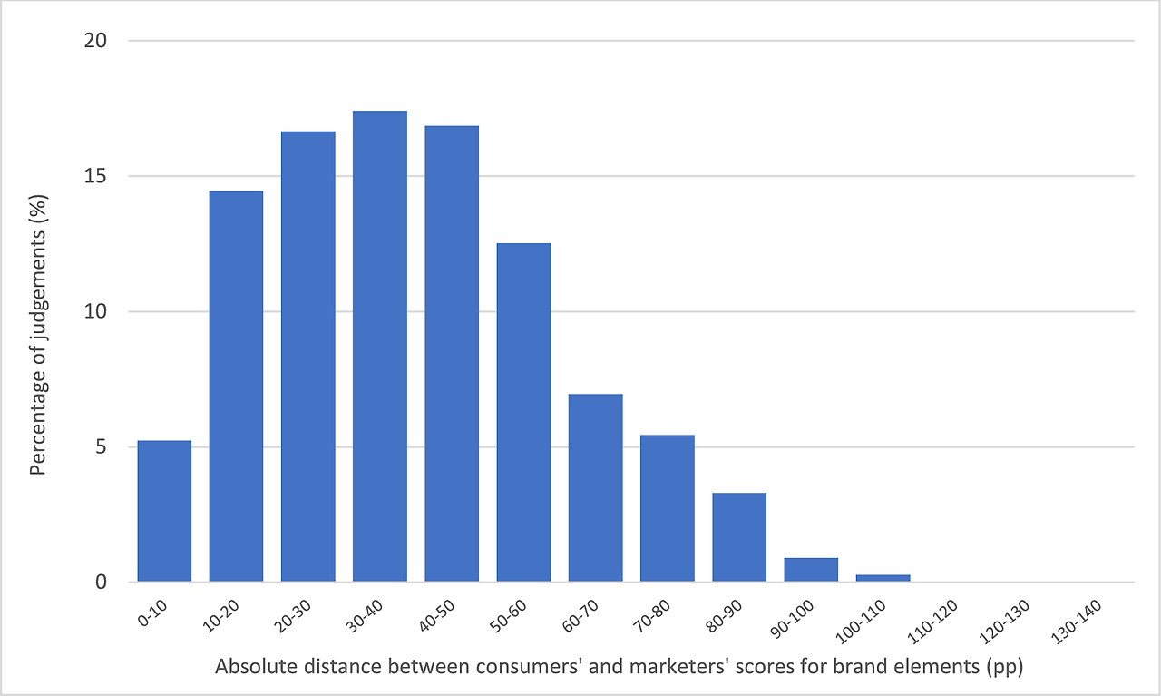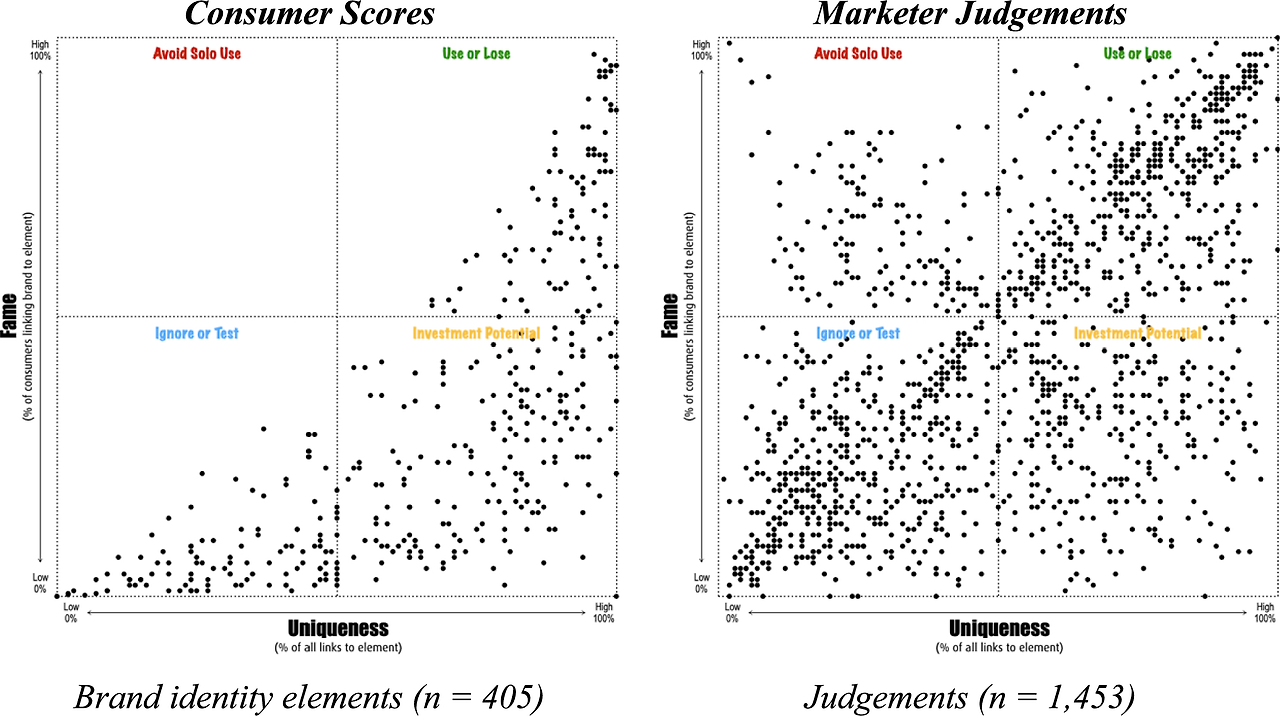 여기서 '브랜드 요소 효과성'이란 특정 브랜드 요소(로고, 색상, 태그라인 등)가 소비자들에게 얼마나 잘 알려져 있고(Fame, 인지도), 얼마나 해당 브랜드만을 떠올리게 하는지(Uniqueness, 고유성)를 종합한 개념이다. 405개 브랜드 요소에 대한 1,453개의 마케터 판단을 분석한 결과, 유클리드 거리로 측정된 소비자 점수와 마케터 판단 간의 평균 차이는 40 퍼센트 포인트에 달했으며, 최대 105 퍼센트 포인트의 차이를 보이는 경우도 있었다.