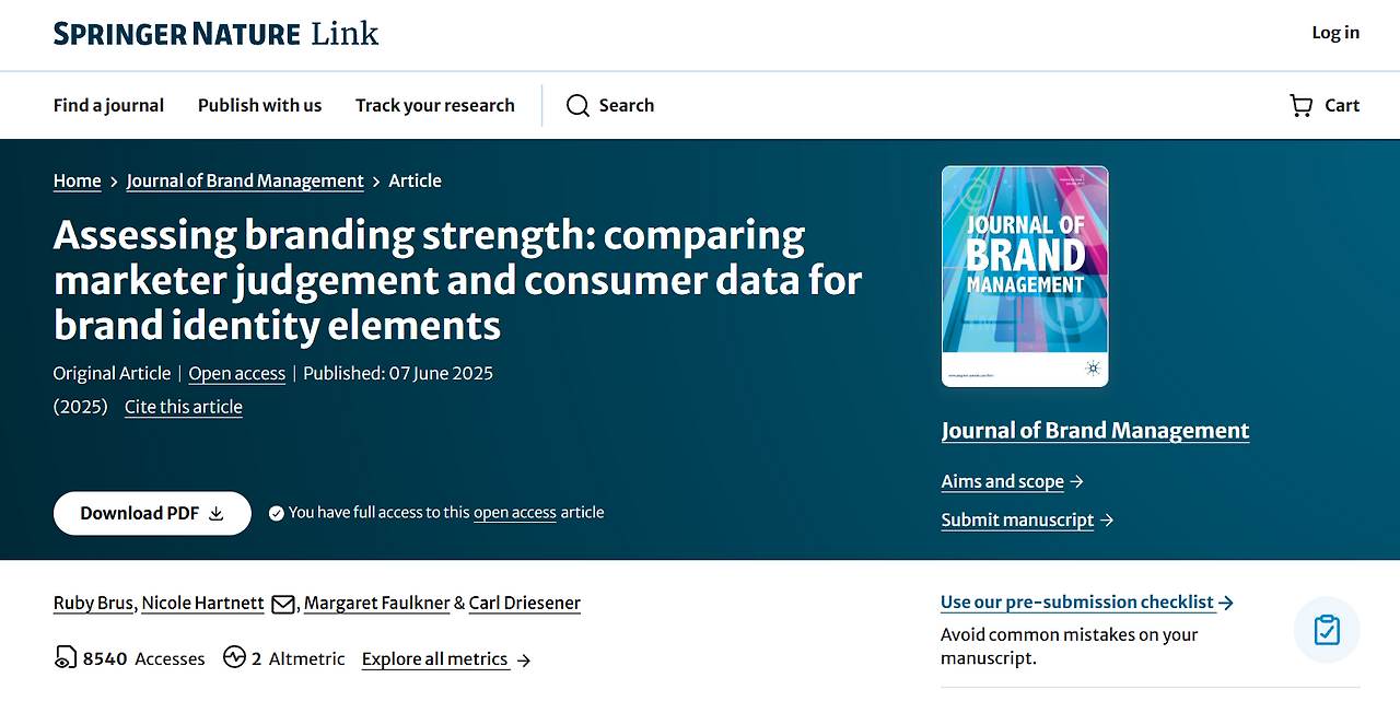 "Assessing branding strength: comparing marketer judgement and consumer data for brand identity elements" (브랜딩 강도 평가: 브랜드 아이덴티티 요소에 대한 마케터 판단과 소비자 데이터 비교)