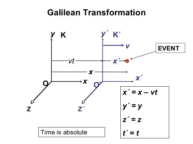 16세기 고전물리학자인 갈릴레이가 도입했던 상대속도를 가지는 관성좌표계와 정지좌표계의 관계를 갈릴레이 변환이라고 한다. 이 당시에는 빛의 속도가 일정하고 속도의 합법칙을 따르지 않는다는 생각을 하지 못했다. 그래서 시간과 공간이 절대적이라는 가정 하에 속도 성분을 좌표계에 투영하였다. 당연히 정지좌표계의 시간은 움직이는 관성좌표계의 시간과 동일하게 흐른다는 가정이 있었다.