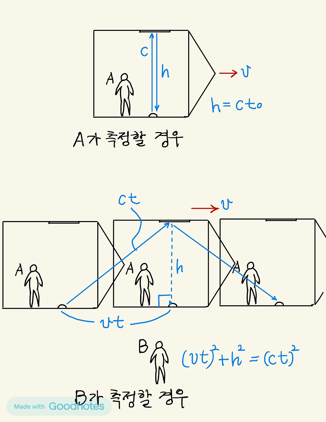 그림. 우주선 이동 수직 방향으로 빛의 왕복 시간 측정