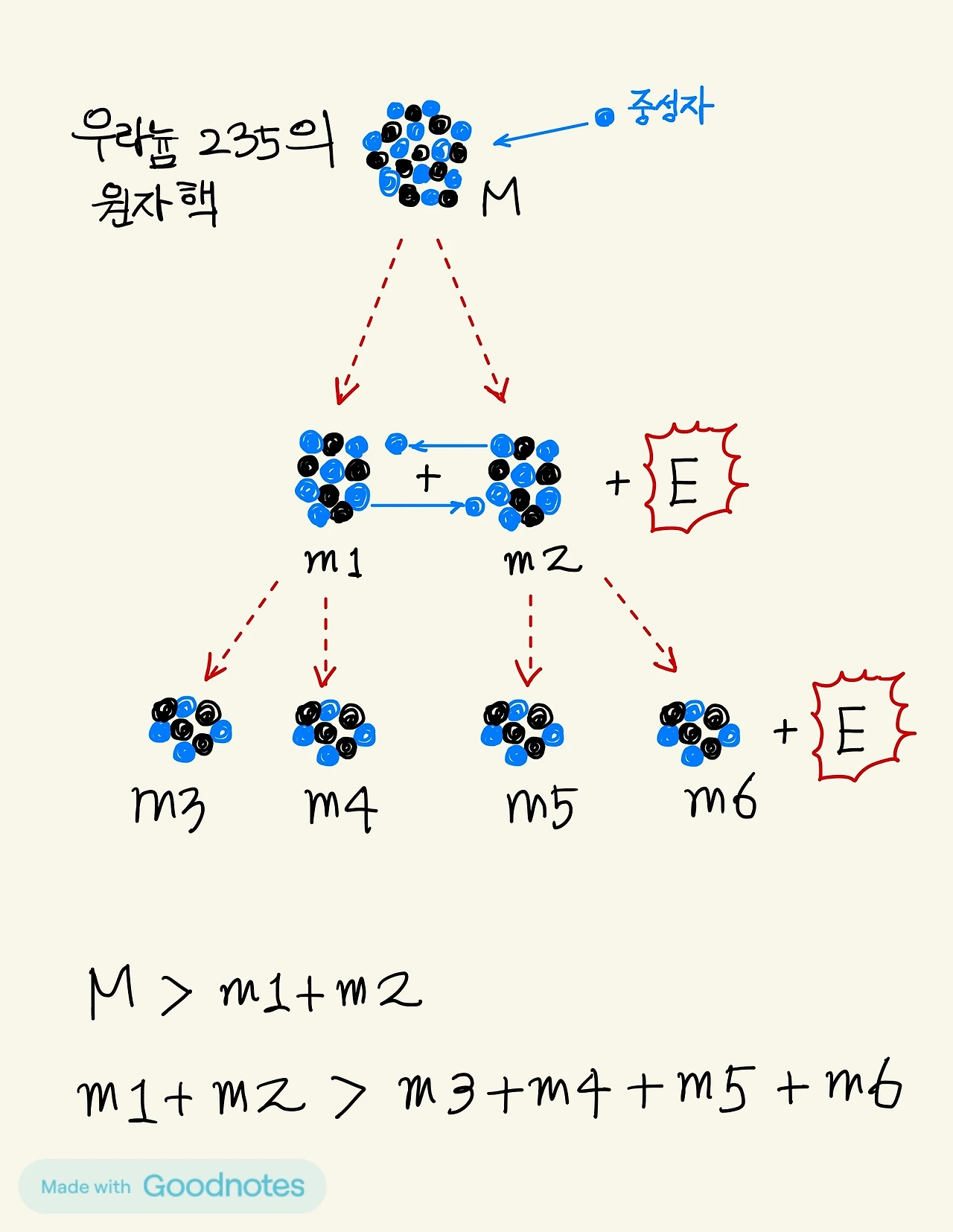 과학자들은 이 과정에서 매우 놀라운 현상을 발견하였다. 쪼개진 원자핵들의 질량의 합이 원래의 원자핵의 질량보다 미세하게나마 감소한다는 것이다. 그리고, 원자핵이 쪼개질 때 발생한 에너지의 크기는 감소한 질량과 정확하게 E = (Δm) c² 의 관계를 만족한다. 아인슈타인의 특수상대성이론에 의해 질량이 에너지로 전환된 사례를 목격한 것이다.