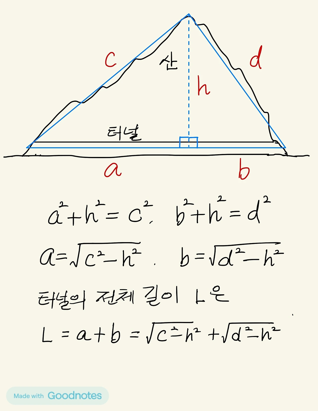 그림. 산 아래로 터널을 뚫을 때 터널의 길이 계산