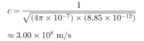 여기에 진공에서의 유전율과 투자율 값을 넣으면 이 파동의 속도는 다음과 같은 상수값을 갖는다.