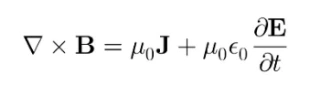 전류(J)가 흐르거나 전기장(E)이 시간의 따라 변하면 자기장(B)이 만들어진다는 법칙이다. μ0는 진공에서의 투자율(permeability)이고 4π x 10^-7 H/m (헨리/미터)의 값을 갖는다. 투자율은 어떤 매질이 자기장 안에서 얼마나 자화 하는가 하는 척도이다. 전자의 스핀이 한 방향으로 얼마나 정렬할 수 있는가 하는 것도 자화의 성질로 볼 수 있다.