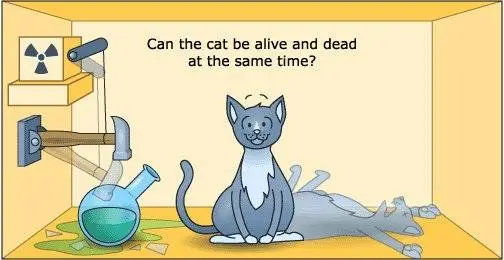 상자 안에 고양이를 한 마리 넣어 둔다. 그 상자 안에는 독극물 병이 놓여있고, 레버에 연결된 망치에 의해서 깨질 수 있도록 설계되었다. 이 레버는 방사능 감지기에 의해서 작동하는데, 방사능이 감지되는 순간 레버가 작동하여 망치로 독극물이 담긴 병을 깨뜨린다. 그러면 상자 안에 있는 고양이는 죽게 된다. 방사능 감지기 옆에 방사능 물질을 놓았다면 지금 고양이는 죽었을 까? 살았을까?