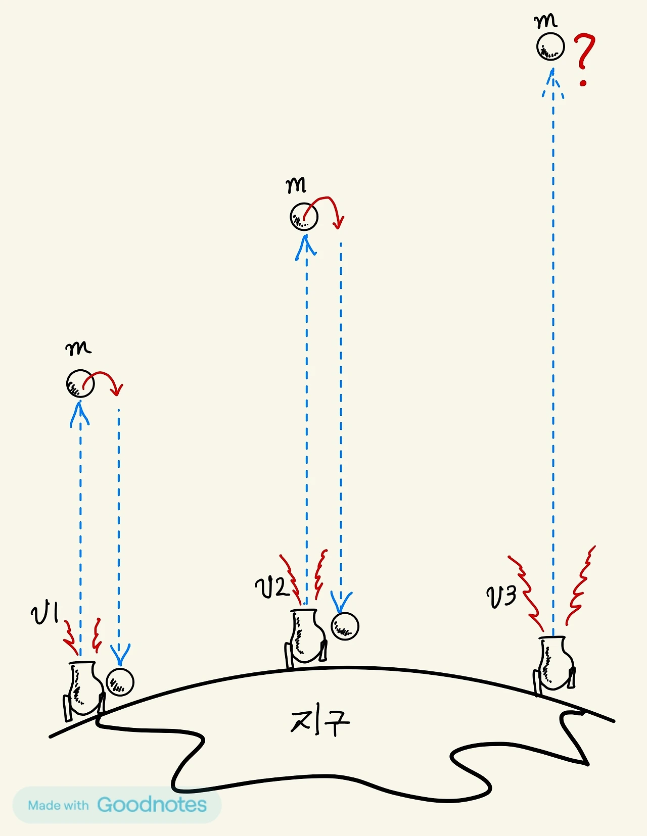 이번에는 앞 서 했던 사고실험 중, 돌멩이가 지구 주위를 인공위성처럼 돌 수 있게 하는 장면으로 돌아가 보자. 이 경우에는 지구 표면에 수평한 방향으로 돌멩이를 날렸다. 이제 그 방향을 틀어 지구 표면에 수직인 방향으로 하늘을 향하여 돌멩이를 던져보자. 손에서 벗어날 때 돌멩이는 최고 속도를 가지고 있으며, 중력에 의해 점점 그 속도가 줄어들고 마침내 정점에서 정지할 것이다. 그다음에는 중력에 의해 자유낙하를 하며 속도가 점점 증가하고, 땅에 닿을 때는 던질 때의 초기 속도로 회복된다. 분명히 그 돌멩이는 얼마 후 다시 땅으로 떨어진다. 같은 방향으로 대포에 돌멩이를 넣고 쏘아보자. 아주 높이 올라갈 테지만 이 것도 역시 얼마 후에는 땅에 떨어진다. 여기서 좌절하지 말고, 고성능 대포에 화약을 잔뜩 장전하여 쏘아보자. 이렇게 하여 돌멩이가 올라가는 높이를 조금씩 높여보자. 그렇게 하다 보면 돌멩이가 정지하지 않고 영영 다시 땅으로 떨어지지 않는 순간이 온다. 바로 돌멩이가 지구 중력 영향권을 벗어나는 순간이다. 물론 대기가 없다는 전제 하에서 가능하다. 지구 탈출을 위한 초기 속도는 어마어마하게 빨라서 만약 대기가 있다면 공기와의 마찰에 의해 돌멩이도 타버릴 것이기 때문이다.