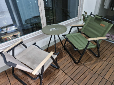 푸릇푸릇 잔디밭이 깔려있는 전원주택은 아니더라도 밖이 내다보이는 커다란 창이 있으면 좋겠다. 그 아래 의자를 끌어다 놓고 차를 마시고, 책도 읽고 싶은 로망이 왜 없으랴. 그게 아니라면 집과 밖이 통하는 테라스라도 있었으면 좋겠다. "테라스! 테라스!" 노래하다시피 했더니 남편이 안방 베란다에 원목마루를 깔고 캠핑용 접이식 의자 2개를 놓아주었다.