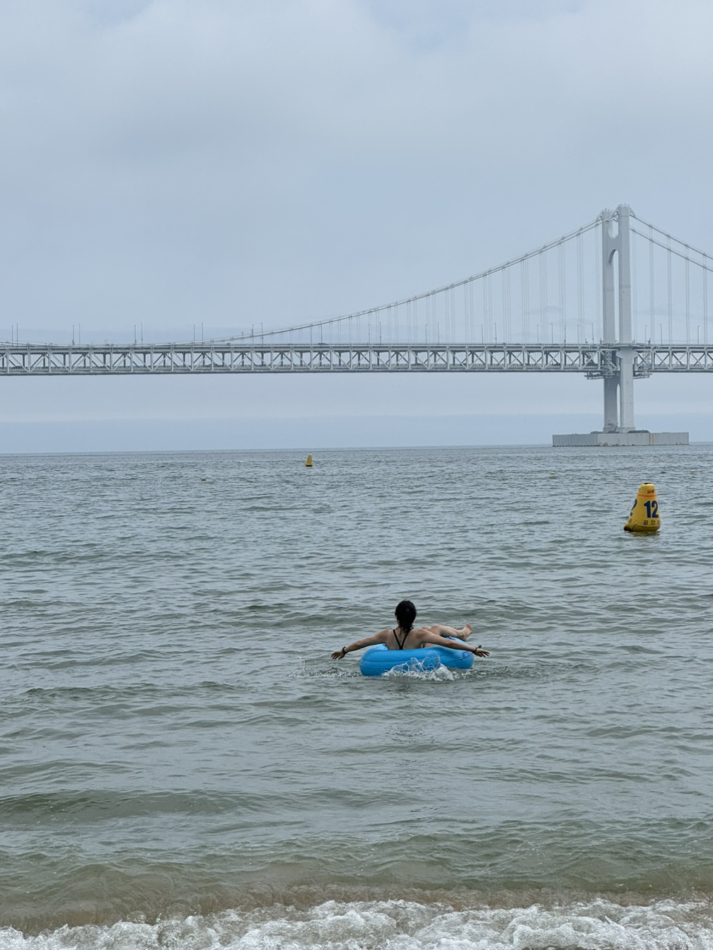 마지막 날인 월요일 아침에 그래서 쉽게 일어나지 못했다. 침대에 소파에 늘어져서 오전 시간을 보내다가 사과님이 복날이니까 삼계탕을 먹으러 가자고, 그러고 나서 물놀이도 하러 가자고 해서 몸을 겨우 일으켰다. 부지런히 예약을 한 사람들이 있어 우리는 약 30분 정도를 기다린 후에야 삼계탕을 먹을 수 있었다. 웨이팅 할 때 우리를 누락한 이슈가 있기는 했지만, 삼계탕의 깔끔하고 시원한 국물과 정갈한 상차림이 모든 것을 용서하게 했다. 배를 든든히 채우고 광안리로 가서 2시간 정도 압축적으로 물놀이를 했다. 물놀이를 하고 싶다고 이야기한 사과님보다 더욱 신난 나는 물 만난 물살이가 되어 튜브 위에 사과님을 태우고 모터보트 같은 발차기를 와다다다 해댔다. 선베드에 앉아 멍하니 바다를, 광안대교를 바라보기도 했는데 월요일 오후에 이렇게 평온해도 된다는 사실은 포상 휴가를 받아 쉬고 있는 직장인 사과님뿐만 아니라 무엇에도 매여있지 않은 나에게도 흡족함을 주었다.