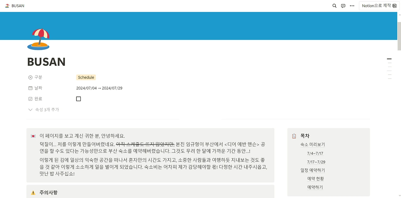 사실 이번 유배에 적극적으로 면회객(?)을 모집했다. 본진의 공연이 단초가 되어 시작된 유배인 만큼 최우선순위는 본진의 부산 공연 올공하는 것이었고, 그다음 우선순위는 일상에서 벗어나 있는 김에 나 자신을 들여다보는 것이었다. 부산에 내려오기 전, 셀프유배 소식을 친한 친구들에게 전할 때마다 주된 반응 중 하나가 "우와, 그렇게 오래 내려가 있다고? 여름휴가 기간인데 나도 너 있는 동안 겸사겸사 부산이나 갈까?"였다. 몇 번이나 그 이야기를 듣다 보니, 4주 가까운 시간 동안 내내 혼자 있어도 나쁘지 않겠지만 나를 보러 누군가가 와준다면 그 사람과의 시간이 얼마나 소중하고 고마울까 하는 생각이 들었다. 숙박비야 어차피 26주 적금으로 해결되었겠다, 내가 부산에 있는 김에 놀러 와서 나와 함께 시간을 보내고 숙박비를 아끼는 대신 맛난 밥을 내게 사주면 어떻겠냐는 제안을 담은 노션 페이지를 만들어서 주변의 소중한 사람들에게 전달했다.