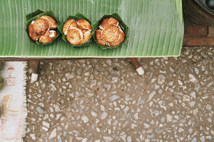 그리고 시장에서는 무엇을 사진 않더라도 꼭 무언가를 먹지. 루앙프라방 시장에서는 코코넛 빵을 먹었다. 냄새도 냄새지만 이렇게 귀여운데 안 먹을 수가 없잖아. 맛은 없었다. 웩하고 뱉어버릴 맛없음이 아니라 맛이 느껴지지 않는 그런 맛없음이었다. 맛있다 맛없다를 논할 때의 그런 맛은 아예 느껴지지도 않았다. 한마디로 맹맛.