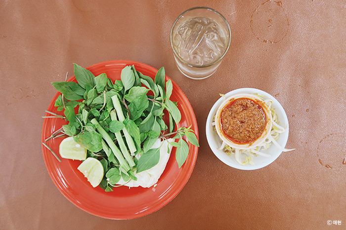 주문한 쌀국수가 나오기 전 먼저 나온 채소. 이 여행 이후 동남아 여러 나라에서 본 것이지만 저 가운데 기다란 마늘쫑 같이 생긴 채소의 정체를 모르겠다. 같이 나온 소스에 찍어 먹으니 너무 맛있어서 한국에서도 찾아보려 했는데 도통 모르겠단말이지. 쌀국수는 맛을 적어놓지 않은 것을 보니 그럭저럭 괜찮았나 보다. 특이한 부분이 없는 적당한 맛이었겠지!