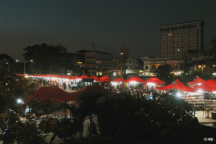 그 노을의 끝에 서있던 야시장. 비엔티엔의 야시장은 루앙프라방의 야시장과 굉장히 달랐다. 내가 기대하는 현지인의 시장이 아니었다. 물론 현지인의 시장이지만 여행자가 기대하는 그런 모습은 아니라 입구에 있는 몇 곳만 보다가 나왔다. 나는 라오스의 야시장에서 상업적인 캐릭터가 그려진 티셔츠를 사고 싶은 게 아니라서.