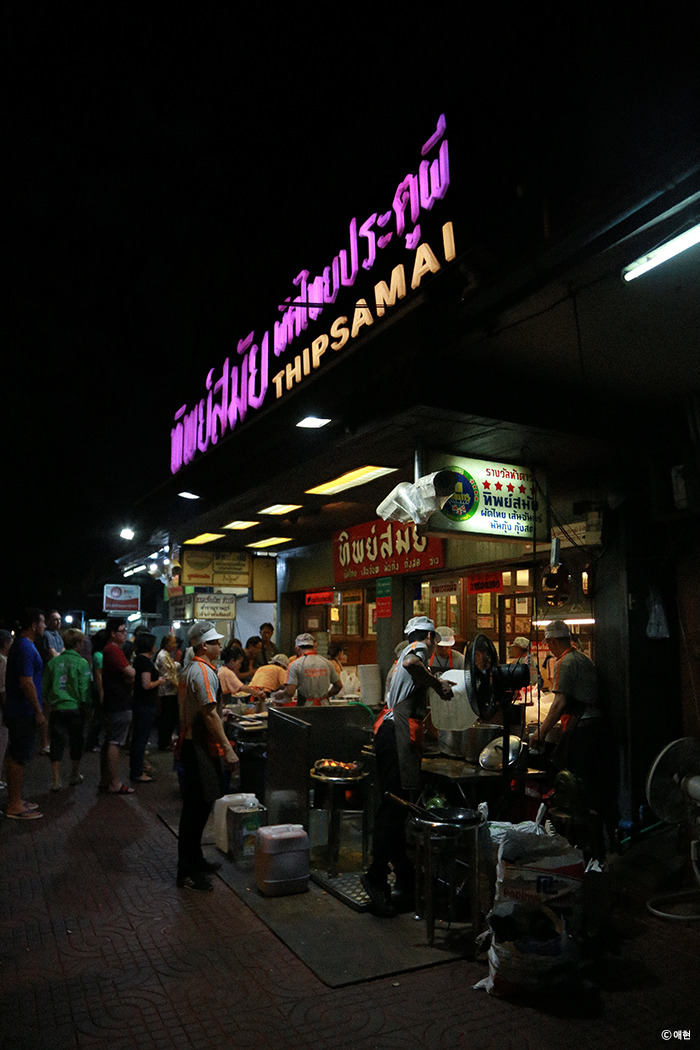 달리던 툭툭이 멈추고 기사님이 앞을 가리키며 정말 조금만 걸어가면 팁싸마이라고 했을 때, 우리는 내리면서도 믿지 않았다. 분명 줄이 길다고 그랬는데 그 어떤 줄도 보이지 않았기 때문이다. 그리고 멀리서 보이는 간판은 초록색이었는데 내가 사진에서 찾아본 팁싸마이의 간판은 전부 분홍색이었는걸! 100바트에 데려다준다고 먼저 우리에게 흥정을 하더니 사기를 친 건가 싶었다. 그러나 그런 기우도 잠시, 정말 아주 조금만 걸어갔는데도 보이지 않던 줄이 보였다. (간판은 계속 색이 바뀌었다.) 팁싸마이의 줄은 소문대로 길었다. 한국에서는 줄 서서 먹는 곳은 늘 피해갔지만 여기까지 왔는데 그 유명하다는 팟타이! 오렌지주스! 를 먹지 않으면 안 될 것 같아서 줄을 섰다. 그리고 주변에 이곳 말고는 딱히 식사를 할만한 곳이 없기도 했다.