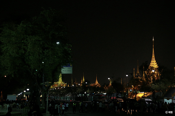 사실 카오산로드는 그냥 스쳐 지나가는 곳이고 우리의 본 목적지는 아시아티크였다. 카오산로드에서 수상버스를 타고 아시아티크를 갈 수 있다길래 기왕 가는 거 아시아티크를 가자! 하는 마음으로 출발했었는데 결론적으로는 가지 못했다. 수상버스의 운영 시간이 한참 지난 터라 택시나 툭툭을 타려 했더니 모두 400바트 이상을 불렀다. 네이버에서 찾아봤을 때는 200바트였다고? 그래서 아시아티크를 다음날로 미뤄버렸다. 그렇지만 이대로 호텔로 가기는 아쉬워서 우리 앞쪽 멀리 보이는 왕궁(아니면 사원)을 보고 그 근처로 가보기로 했다. 그런데 이게 무슨 일이람, 그쪽으로 가니 사람들이 가득해서 멀찍이서 바라만 봐야 했다. P는 아무래도 누가 공연을 하고 그 관객들인 거 같은데 누구의 공연인지 말이 통하지 않아 알 수 없다며 안타까워했다.