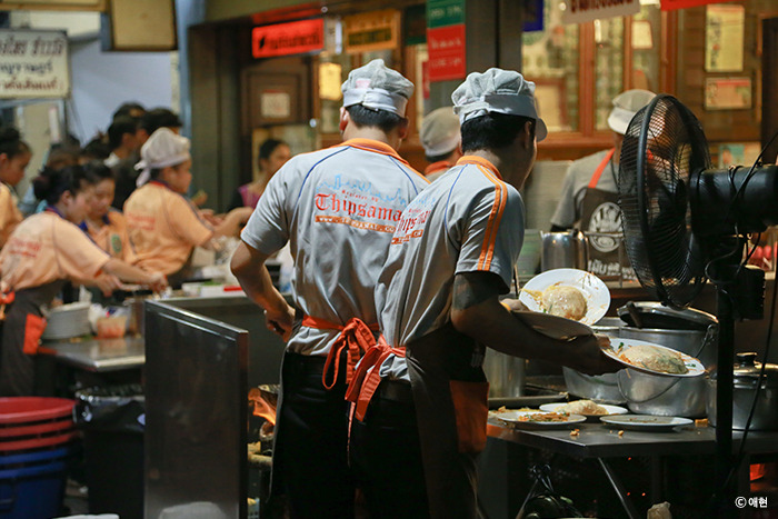 그래도 줄에 비해 팟타이를 먹는데 오랜 시간이 걸리지 않았다. 가게에 들어가 자리를 잡고 주문한 팟타이가 나오기까지 30분가량 걸린 것 같다. 긴 줄에 비해 이 정도면 회전율이 꽤 높지 싶다. 팁싸마이는 자릿세도 받았는데 일반석은 인당 5바트, 에어컨선은 인당 10바트였다. 기다리는 동안 땀이 날 정도로 더웠기에 에어컨선을 선택했지만 막상 들어가 보니 일반석도 충분히 시원했다.