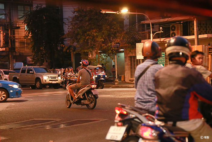 그리고 툭툭을 타고 가며 타길 잘했다고 생각한 게 거리에 차가 너무 많았다. 방콕 하면 트래픽 잼이 연관검색어로 나올 만큼 길이 많이 막히는 곳이지만 이런 좁은 길도 꽉 찰 거라곤 생각지 못했다. 그나마 툭툭은 택시보다 조금 작아서 택시라면 어김없이 멈춰서 기다려야 했을 곳에서도 요리조리 빠져나가 달릴 수 있었다. 툭툭 마저도 빠져나갈 수 없는 구간이 있긴 했지만 택시를 탔더라면 팁싸마이까지 가는 길이 두배는 멀게 느껴졌을 거다. 여기에 우리를 태운 툭툭의 기사님이 스릴을 즐기는 편인지 엄청 빠르게 달렸다. 라오스에서 탄 툭툭은 느릿느릿- 느긋했는데 방콕의 툭툭은 엄청 빨랐다.