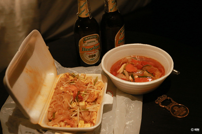 분명 팁싸마이에서 팟타이를 먹었지만 또 배가 고파졌다. 그래서 호텔 골목 초입에 있는 길거리 노점에서 팟타이와 이름 모를 태국 음식, 편의점에서 비어 라오를 사서 돌아왔다. 원래는 근처 펍에 가려했는데 낮에는 괜찮아 보이더니 밤에 보니 메뉴들이 전부 별로였다. 팟타이를 사서 돌아오는 길에 어느 한 펍에서 (아까까지만 해도 분명 조용했는데) 생일 파티를 즐겁게 하고 있길래 그냥 펍에 갈걸 그랬나? 하고 잠시 후회하기도 했지만 호텔로 돌아와 먹은 노점의 음식들이 맛있어서 또 금세 잊었다.