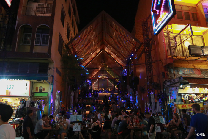 거리의 안쪽으로 들어갈수록 외국인들로 가득한 펍이 나타났다 사라졌다를 반복했다. 다들 이 펍들의 사진만 찍어 올린 거였구나. 카오산로드에서 가장 좋았던 곳은 계단형 펍. 실제로 보면 엄청 재밌는 곳인데 사진으로는 담아낼 수 없어 아쉬웠다. 한 외국인은 난데없이 홀로 신이 나서 웨이브를 타다 지나갔다. 외국인들 저스틴 비버 싫어한다더니, 그가 춤을 춘 펍에서 흘러나오는 건 저스틴 비버의 노래였다. 그래 솔직히 인정해, 비버 노래가 좋긴 하지?