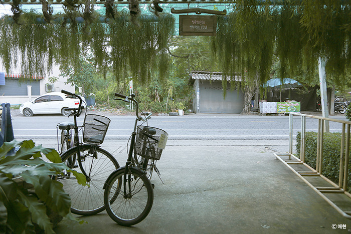 신나게 달리고 있는데 하늘이 어둑어둑해지더니 이윽고 비가 내리기 시작했다. 운이 좋게도 근처에 카페가 여러 곳 있어서 그중 자전거를 세울 수 있는 분위기 좋은 카페에 들러 비를 피했다. (방끄라짜오 대부분의 식당과 카페에는 자전거를 세워둘 수 있는 공간이 있다.)