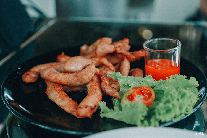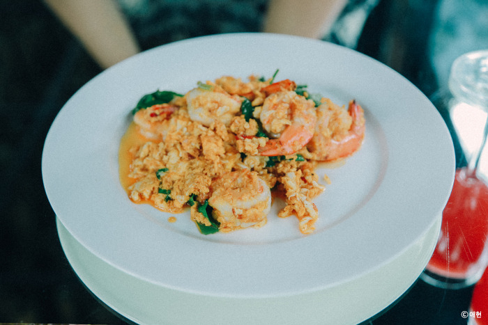 레스토랑은 1층, 2층에 모두 자리가 있었는데 자전거 타느라 땀을 흘려서 시원한 1층에 자리 잡았다. 1층은 에어컨이 빵빵한 실내 실외가 다 있었고 2층은 야외석만 있었다. 어떤 메뉴가 좋을까 고민하다 직원분이 추천해주는 베스트 메뉴와 P가 고른 돼지 튀김을 시켰다. 베스트 메뉴와 돼지 튀김 둘 다 맛있었으나 이 중 최고는 베스트 메뉴! 괜히 베스트 메뉴가 아니네. 푸팟퐁커리 맛이 나는데 게살 대신 새우가 들어있었다. 새우는 항상 옳지. 먹고 나서도 하나 더 먹고 싶을 만큼 좋았다.