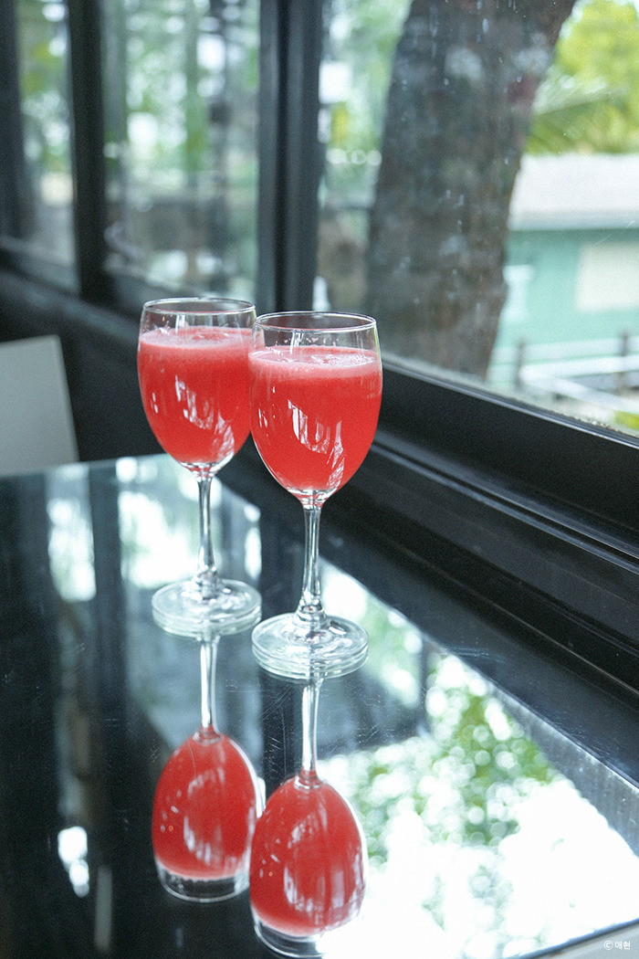 샴페인 잔에 담겨 나온 땡모반. 땡모반은 시원해야 제맛인데 미지근했다. 방콕에서 마신 땡모반 중 가장 비쌌지만 가장 맛없었다.