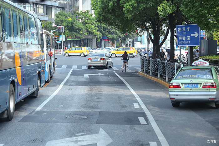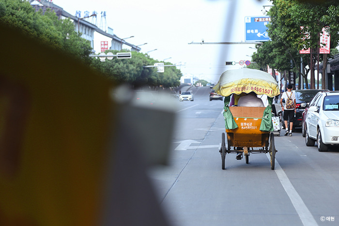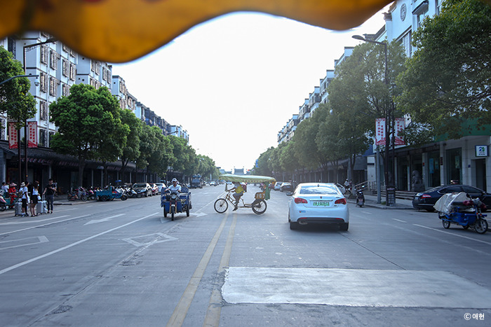 상해행 티켓을 끊고 나서 다시 현재로 돌아와 어떻게 시탕으로 가야 하나 방법을 모색했다. 그러다 '우리에게 호객 행위를 하지 않으면 그냥 내가 하자'란 생각에 자전거 택시가 몰려있는 곳으로 갔다. 그리고 호객 행위 끝에 한 대에 각 20위안씩 두 대를 타고 이동, 호스트가 알려준 은행나무 아래에 내리니 호스트가 우리를 기다리고 있었다.