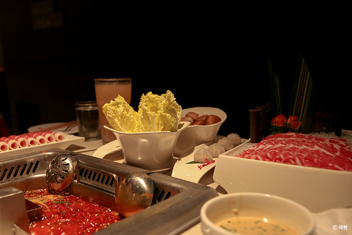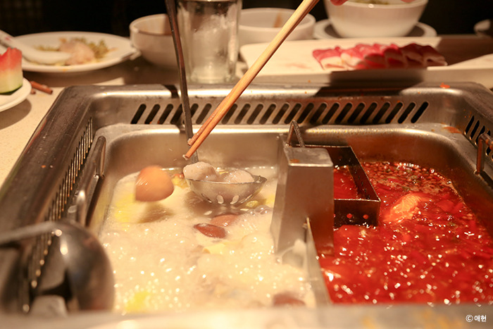 그렇게 놀다 보니 어느덧 훠거 먹을 시간! 직원은 토마토탕을 권했지만 그래도 처음 먹는 훠궈인 만큼 제대로 먹고 싶어 백탕과 홍탕을 시켰다. 그리고 홍탕이 나오자마자 바로 후회했다. 그냥 토마토탕이나 먹을걸... 기분 나쁘게 매운맛이었다. 서비스의 끝판왕이라는 다른 사람들의 말처럼 친절한 직원이 매워하는 우리를 보고 홍탕에도 백탕 국물을 넣어 주었으나 기분 나쁜 맛은 여전했다. 우리나라의 매운맛과 전혀 다르네. 탕은 그렇게 시키고 고기 3 접시, 새우 완자 3 접시, 버섯과 배추를 시켰다. 그리고 직접 만드는 소스까지. 힘들게 찾아갔지만 큰 보람은 없었다. 그래도 한국에서 먹었으면 돈 꽤나 나왔을 것 같은데 중국 본토라 그런지 400위안 정도만 나와서 만족했다. (후에 칭다오 하이디라오에서는 홍탕 대신 토마토탕을 시켜 정말 맛있게 먹었다. 그냥 홍탕이 우리 입맛에 맞지 않았던 것이다.)