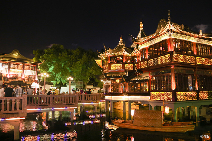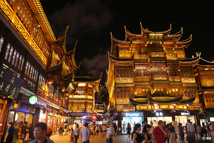 두어 시간 자고 일어나 예원으로 갔다. 예원역 근처에 숙소를 잡아두고 이제야 예원에 오다니. 그도 그럴 것이 우리는 갈 곳이 많았단 말이야. 밤의 예원은 반짝반짝했다. 와이탄의 야경보다도 훨씬 반짝이고 멋있었다. 이래서 다들 예원은 밤에 가라고 했구나. 아직 제대로 된 예원은 들어가지도 않았는데, 예원으로 들어가는 길에 있는 상점들마저 '여기가 예원이야.'라고 알려주고 있었다.