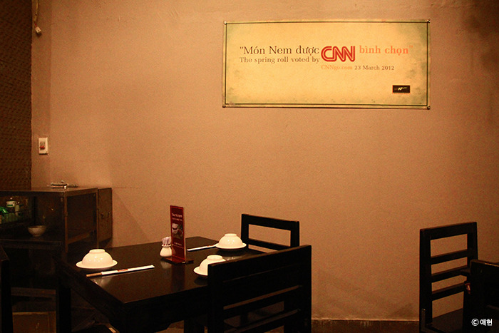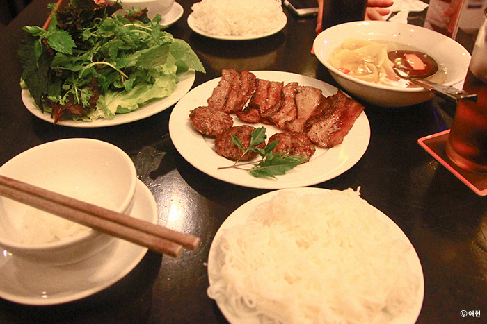 카페에서 나오니 어느덧 저녁 먹을 시간이 되었다. 내 주변에서 맛집 찾는 걸 가장 좋아하는 것 같은 M이 또 하나의 맛집인 <꾸안 넴 Quán Nem>에 가자고 했다. 식당 발견은 M이, 길 찾는 건 내가. CNN이 선정한 블라블라 맛집으로 분짜와 넴이 맛나다고 했다. 꾸안 넴은 그동안 우리가 전혀 가보지 않았던 마을에 있었다. 여긴 어두운데도 무섭지 않았다. 꾸안 넴에 도착해 분짜와 넴을 하나씩 시키며 고수는 빼 달라고 했음에도 불구하고 야채 더미에는 고수가 있었다. 알았다며, 빼준다며! 그나마 분짜는 국물에 내가 먹고 싶은 야채를 넣어 먹는 방식이라 고수를 먹거나 아니면 굶어야 하는 불상사는 피할 수 있었다. 난생처음 먹어본 분짜는 신맛이 나긴 했지만 맛은 또 있어서 잘 먹었다. 넴도 두툼한 부침개 같은 맛이라 역시 잘 먹었다.