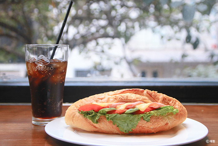 그렇게 한참을 앉아있다가 도무지 추위가 가시질 않아 성당 맞은편 카페로 자리를 옮겼다. 카페에 들어온 김에 아까 반미를 제대로 먹지 못해 배고팠던 나는 무난한 햄 치즈 샌드위치도 하나시켰다. 이번엔 고수가 들어있느냐 묻는 걸 잊지 않았다.