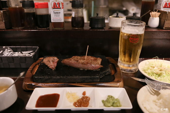 스테이크를 제외한 밥과 샐러드, 달걀국 같은 수프는 전부 셀프. 밥을 양껏 먹을 수 있어 좋았다. 세 칸으로 나눠져 있는 소스 그릇엔 각자 입맛에 맞는 소스를 담아 먹으면 되는데, 나는 1. 와사비 2. 마늘+쌈장 3. 기본 스테이크 소스를 담았다. 셋 다 맛있지만 와사비가 독특하니 좋았다. 얏빠리 스테이크는 어마어마하게 맛있지는 않았지만 질기지 않고 저렴한 맛에 먹기 좋았다. 여기에 맥주 한 모금을 더하니 캬, 여기가 천국이구나.