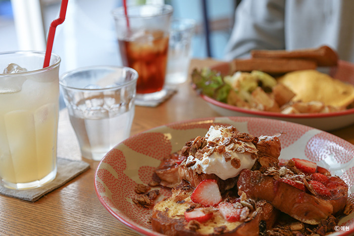 맞은편 주먹밥집의 줄은 이른 아침부터 엄청 길었는데, 카페 C&C BREAKFAST는 비교적 여유로웠다. 카페 안에도 딱 하나 빈자리가 있어 그곳에 자리를 잡았다. 남은 돈을 헤아려보니 먹고 싶은 것을 마음대로 먹을 수 있는 형편이 아니라 각자 가진 돈에 맞추어서 나는 기본 프렌치토스트에 딸기 토핑을 얹고 여기에 애플주스를, P는 기본 오믈렛과 아이스 아메리카노를 시켰다.