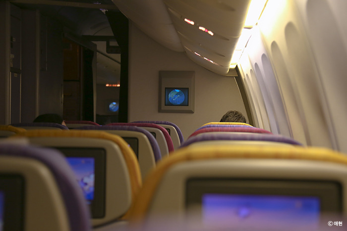 안내판을 보니 출발이 30분 지연되었다기에 의자에 거의 드러눕다시피 있다가 거의 끝물에 비행기를 탔다. 3 3 3 좌석 중 오른쪽 끝 창가 자리에 앉았다. 나는 장거리든 단거리든 무조건 창가 자리를 선호하는데 바깥 구경하기도 좋고 머리를 기대어 자기도 좋다. 어차피 비행기 안에서는 화장실을 가지 않으니 어지간해서 복도로 나갈 일도 없고. 단점이라 하면 착륙 후 복도 쪽에 앉는 사람에 따라 밖으로 빨리 나가지 못한다는 건데 그 정도 리스크는 감수할 수 있어. 이번 방콕행에서는 복도 쪽에 다리가 조금 불편한 서양 할아버지가 앉았다. 빨리 내리려던 내 계획은 무산되었으나 그는 스윗 했다. 그와 내 사이에는 아무도 앉지 않았다. 덕분에 편안한 비행.